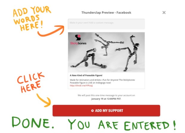 How To Join the Thunderclap to enter the contest—A Visual Guide (This example is from our first Thunderclap contest from January—the new message will vary.) *Please note, the images below are just jpeg examples. To enter, you'll need to go Here.
